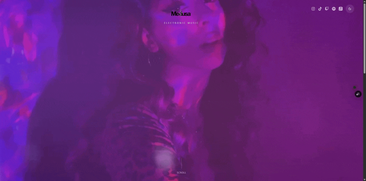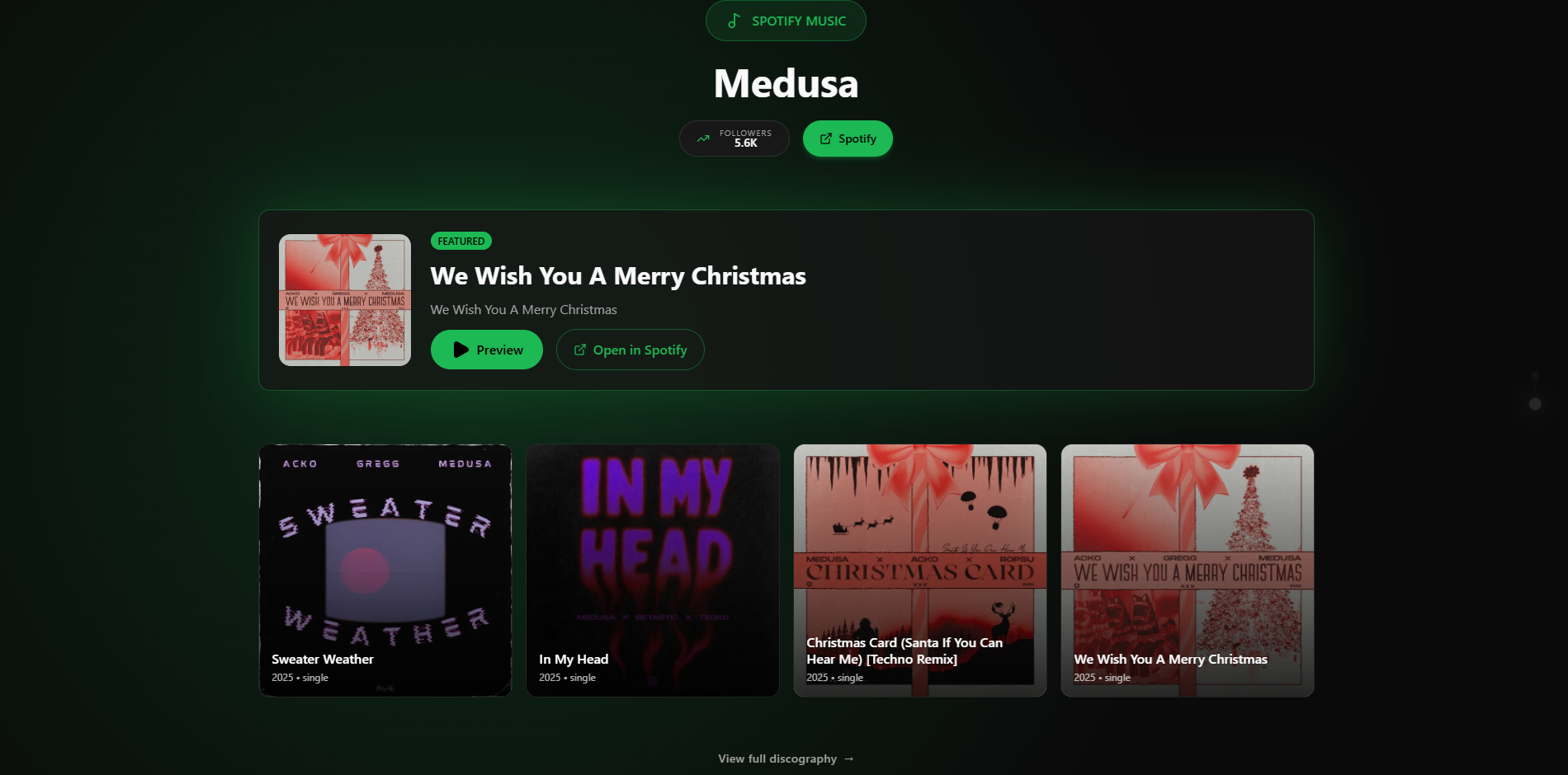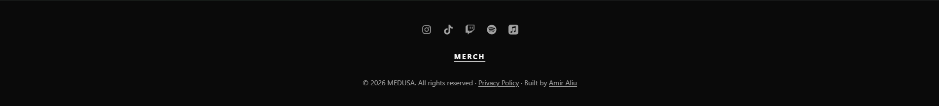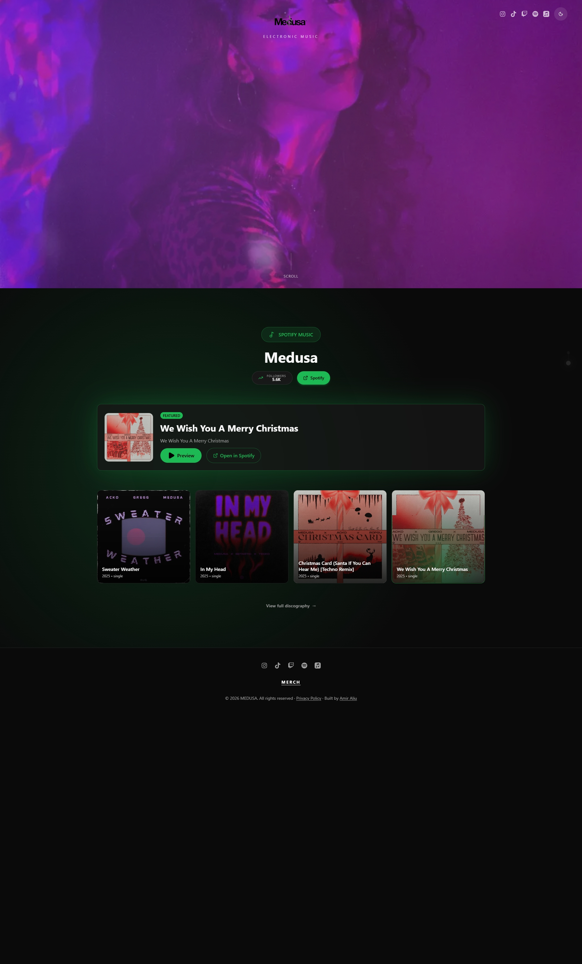 Complete homepage layout showcasing the brand, music, and navigation structure.The full music library view with albums, singles, and most-played tracks.The immersive hero section introducing Medusa with a neon-lit visual identity.Homepage music section featuring highlighted releases and direct Spotify playback.Footer section containing social media links, merch access, and legal information.