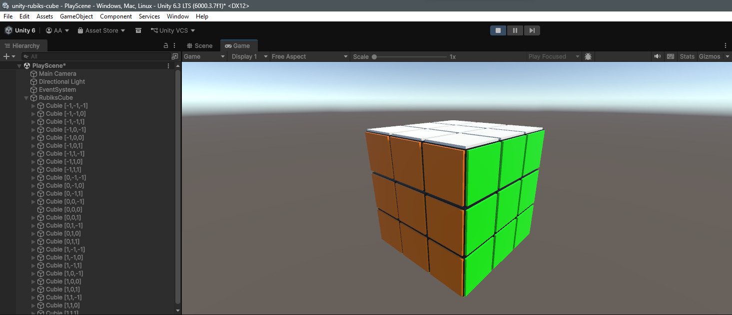 A Rubik’s Cube game built in Unity using C#, featuring a fully interactive 3D cube with realistic rotations, scramble logic, and solve-state validation. Designed as both a puzzle game and a foundation for experimenting with cube algorithms and solvers.